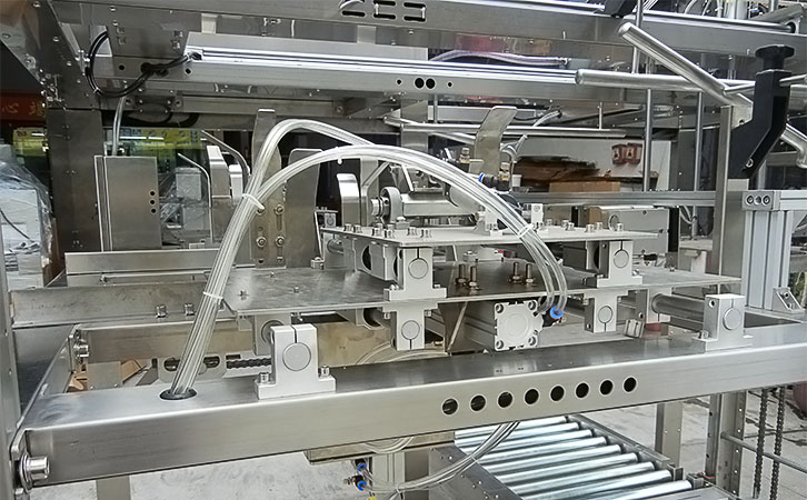 整機由PLC微電腦控制,自動報警,故障提示,采用人機界面控制,操作簡單,維護方便快捷。整機流程包括自動輸送上料系統、自動吸紙板、成型折邊角、成型紙箱成品輸出;