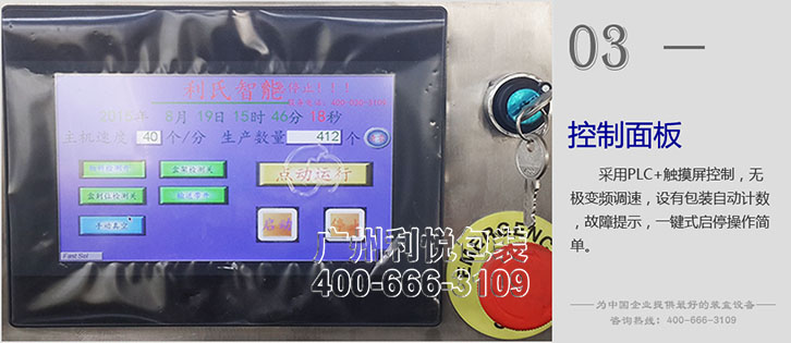 機器采用PLC控制,觸摸屏操作界面,速度1-40盒/分鐘可調,帶紙盒包裝自動計數,故障顯示功能。