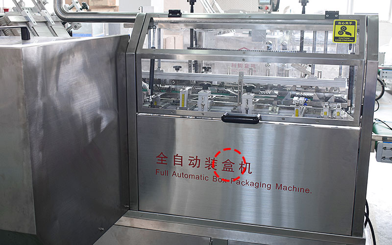 更具有產品進盒不到位或卡料自動停機,缺紙盒自動報警,無產品不開盒,觸摸屏自動顯示故障,并停機報警,顯示機器操作及維修方式。